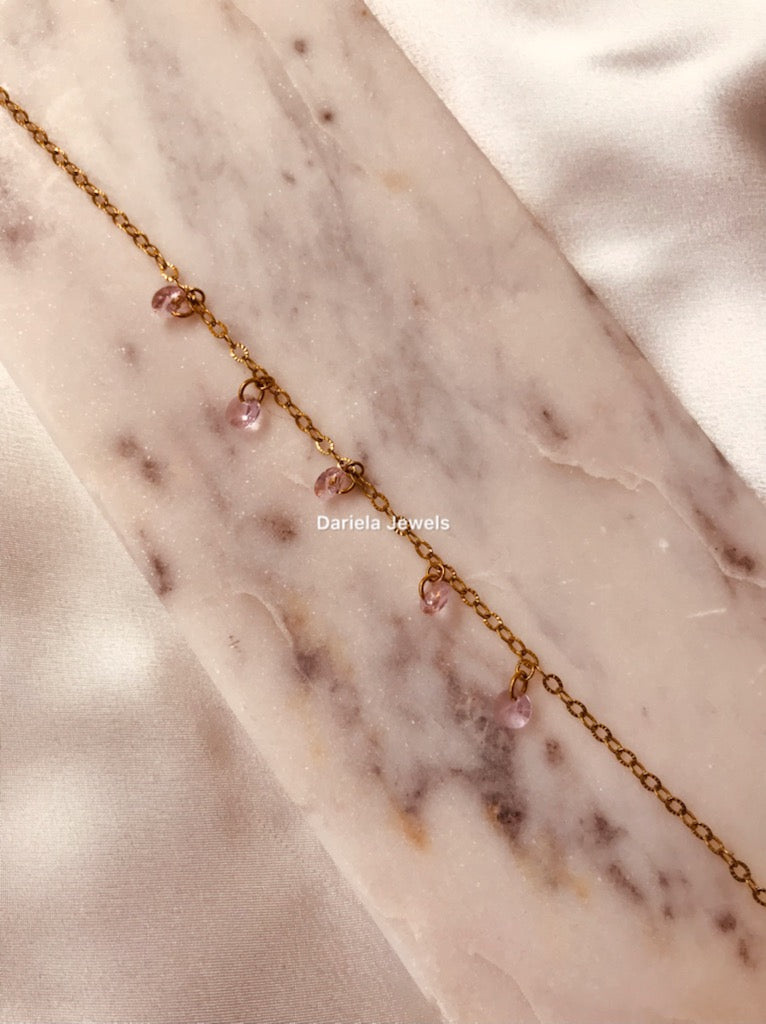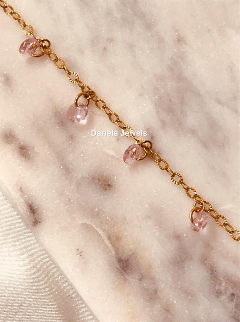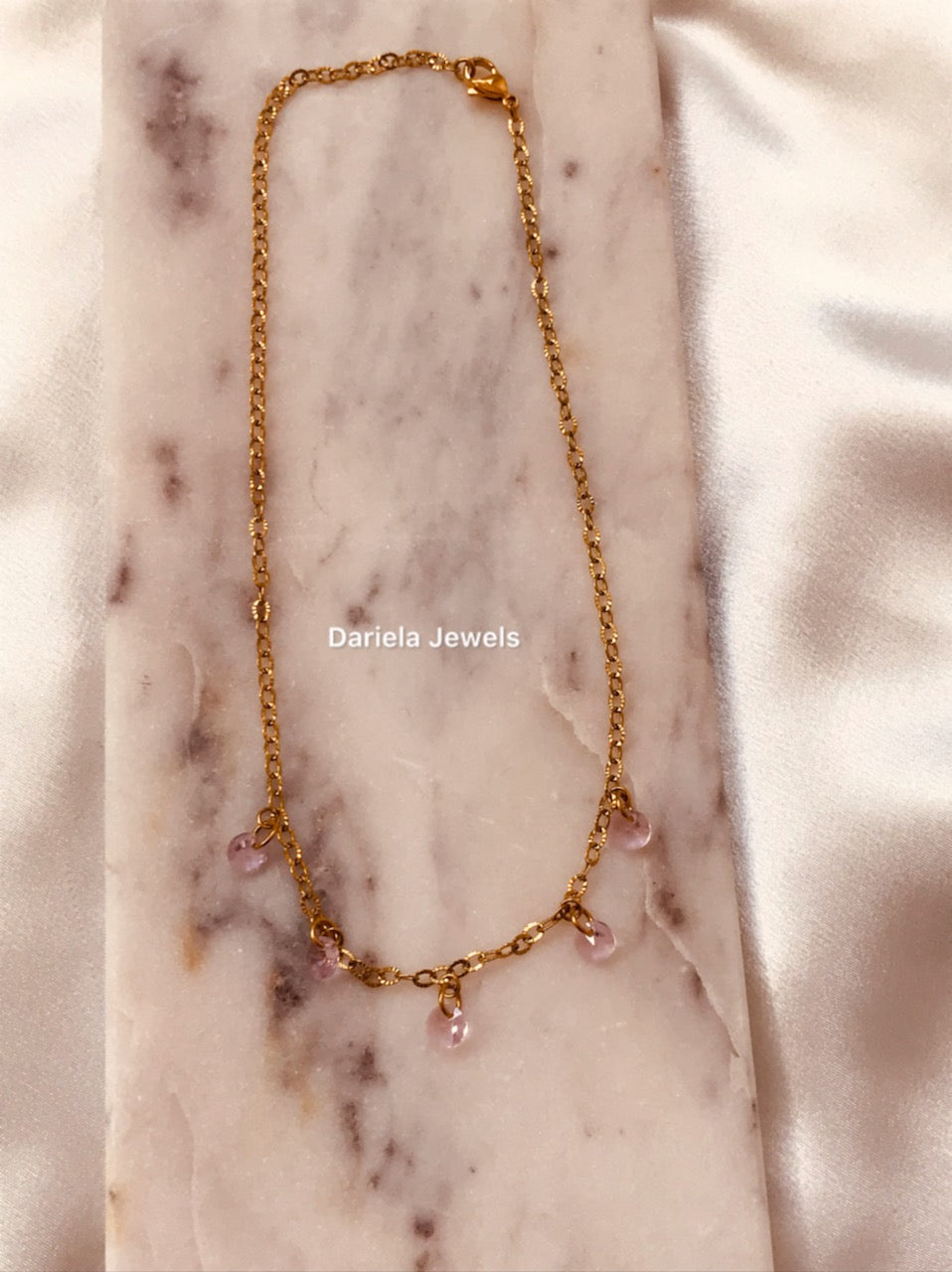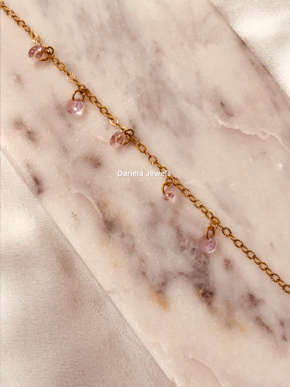 - Pampilles en crystal rose : De délicats cristaux qui ajoutent une touche lumineuse et romantique à votre look.