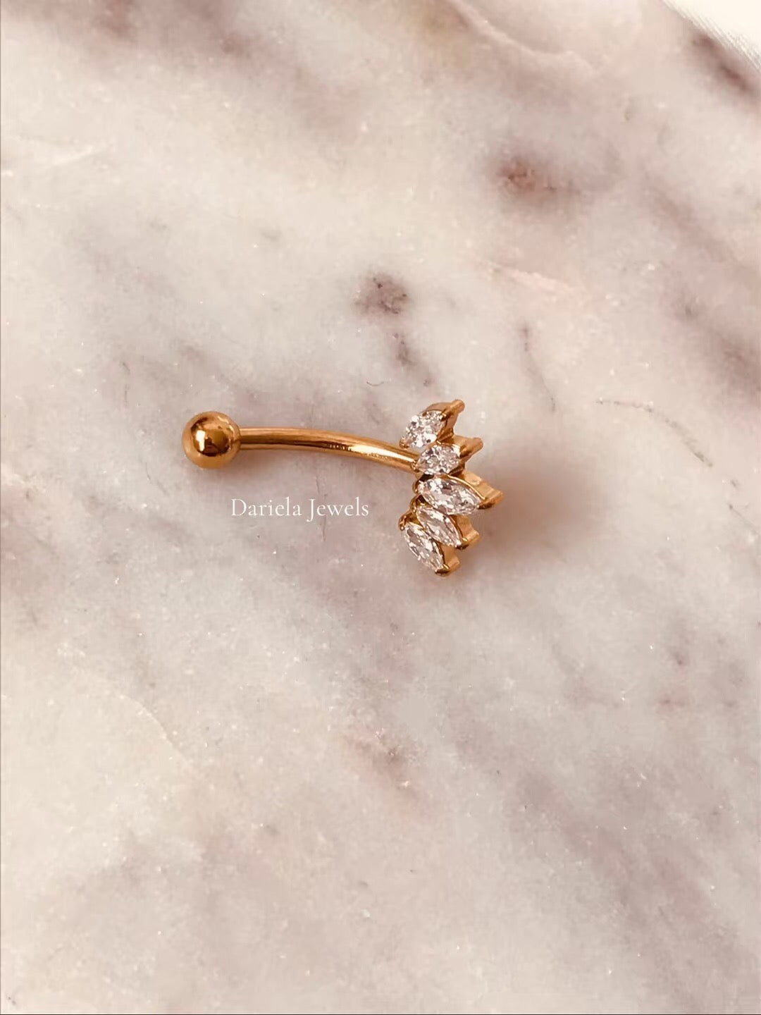 Orné de magnifiques oxydes de zirconium, le piercing Lilivia capte la lumière et offre une brillance intense, pour un rendu chic et sophistiqué. Son design élégant en fait un bijou parfait aussi bien pour l’été que pour toutes les occasions où vous souhaitez mettre votre nombril en valeur.