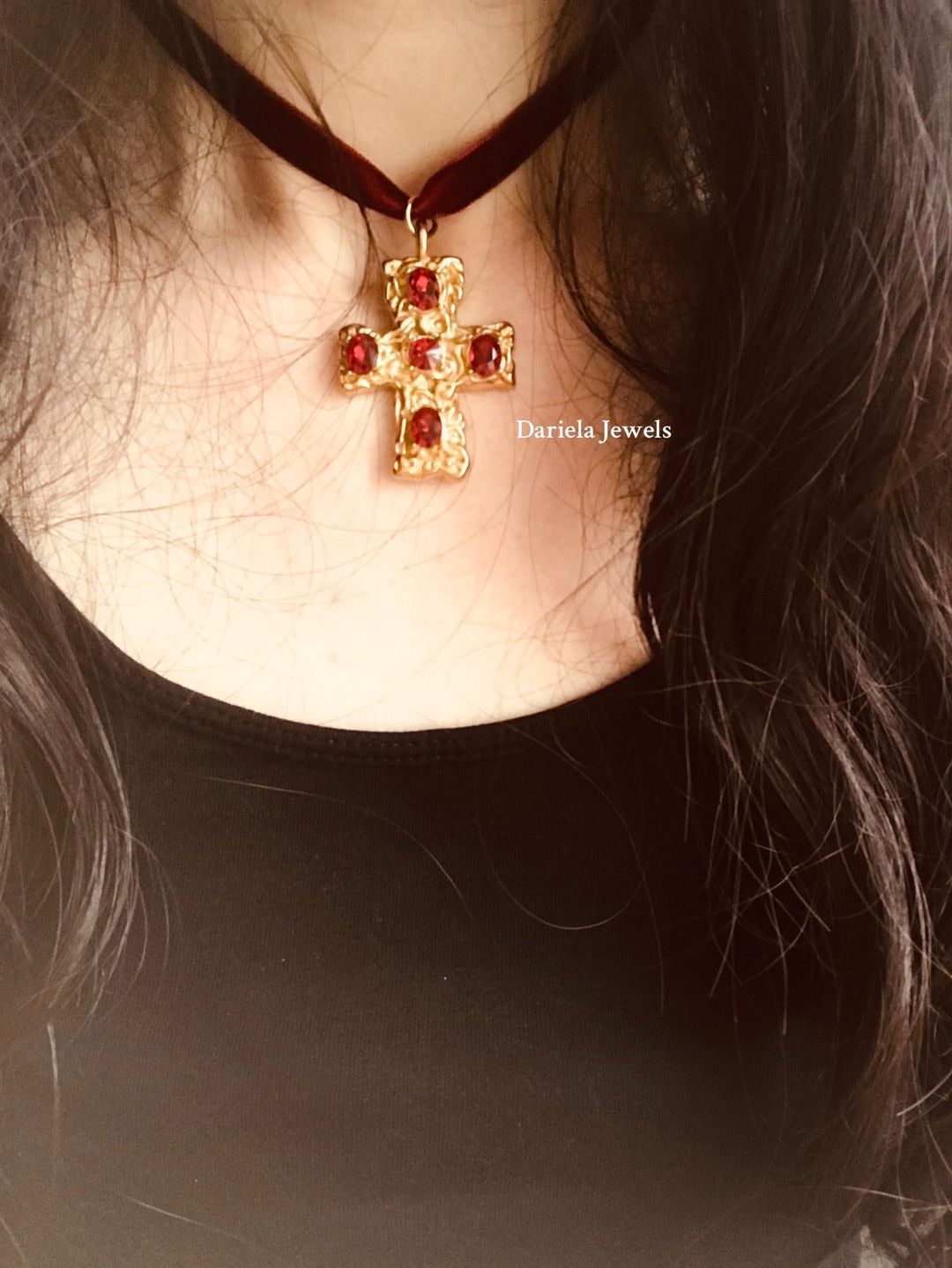 Ajoutez une touche de mystère et d'élégance à votre style avec notre ras de cou Elena. Confectionné à la main avec soin, ce collier en velours rouge intense sublime votre cou d'un éclat raffiné. Son pendentif imposant en forme de croix évoque l'esthétique gothique chic, rappelant les bijoux emblématiques portés par les héroïnes de séries cultes.